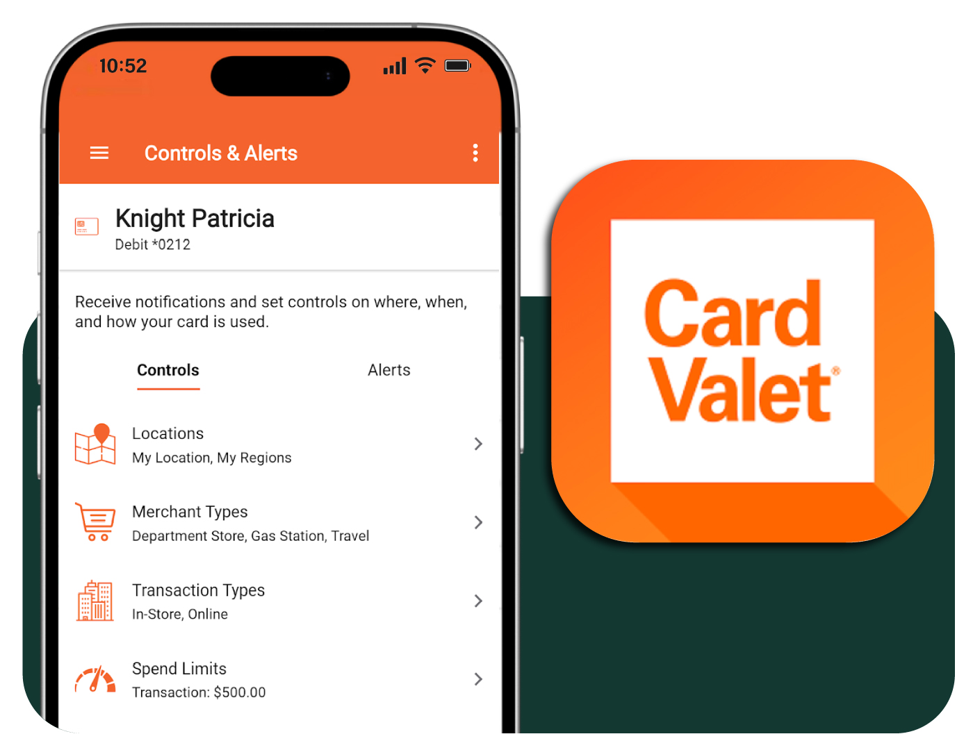 Take control of your business debit cards with CardValet®. Turn cards on or off, set spending limits for employees, and get instant alerts for purchases - all from your phone. Learn more about CardValet for business debit cards.
