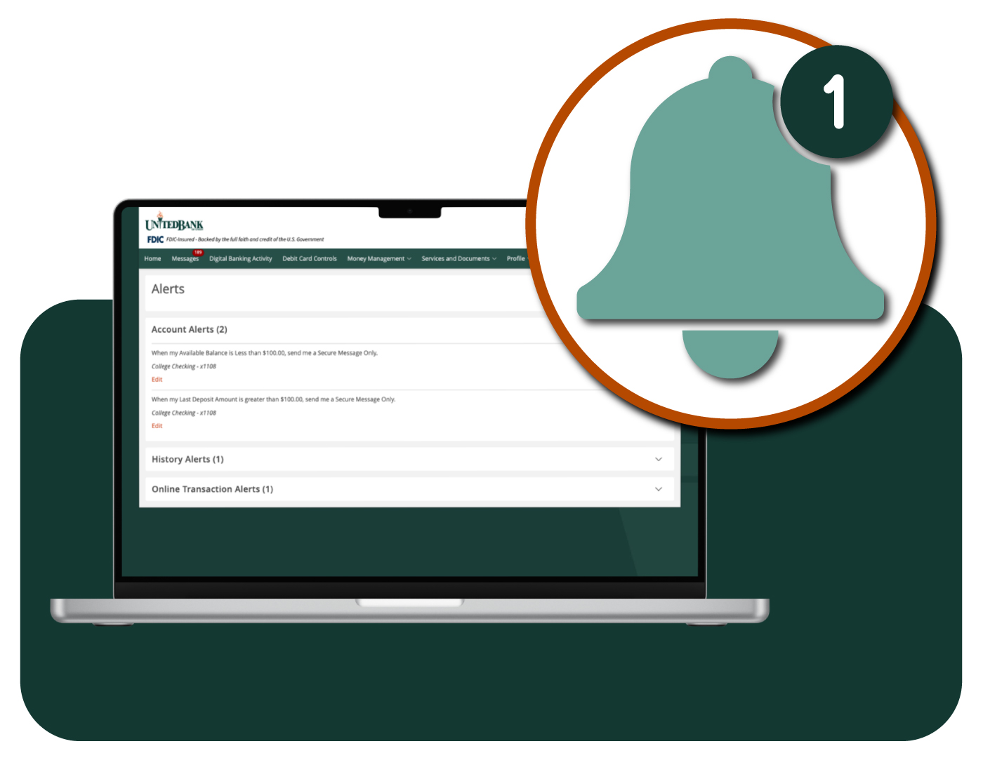 Stay in the know with personalized alerts for your accounts. Whether it's a low balance, large transaction, or new deposit, you can choose to receive alerts via secure message, call, text, email, or push notification.