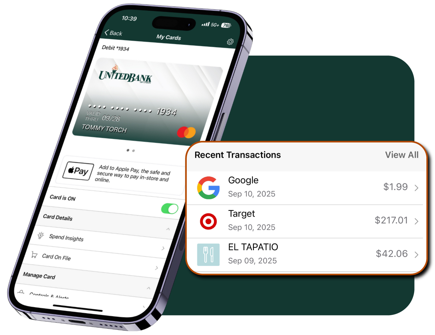 At United Bank of Union, your security and peace of mind matter most. With Debit Card Controls in Digital Banking, you're always in charge of your debit card. Whether you want to keep your spending on track or protect your accounts, the tools you need are just a click away.