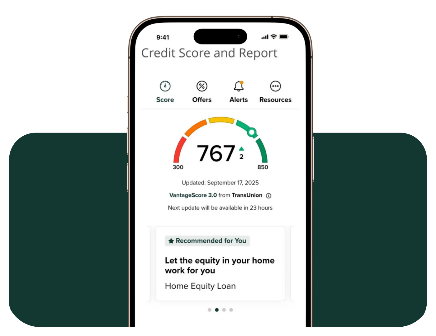 Did you know you can check your credit score for free inside Digital Banking? SavvyMoney Credit Score & Report helps you see how your score changes over time, understand what affects it, and set goals to stay on top of your financial health.