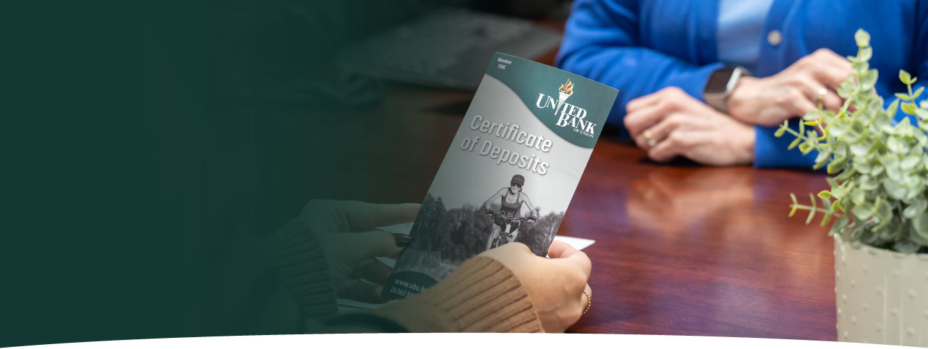 When you open a Certificate of Deposit with United Bank of Union, you're choosing a safe and dependable way to build your savings. CDs offer guaranteed returns over a set term, making them an ideal choice if you want the stability that comes with a fixed rate.